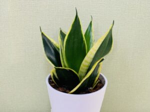 この種類は、長くて尖った葉が特徴で、縦に伸びるスタイルがインテリアにぴったりです。特に高さがあるため、広いリビングルームや大きなテレビの横に置くと、部屋全体が引き締まった印象になります。 - サンスベリア・ラウレンティー
