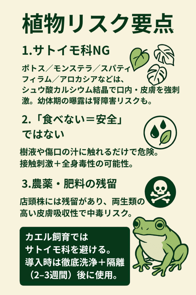 多くの飼育者は「カエルは植物を食べないから大丈夫」と考えがちですが、リスクはそれだけではありません。